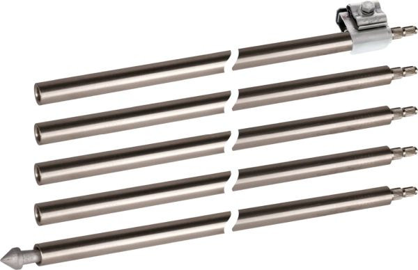 D18014 Tiefenerder Set 5 m V4A, Edelstahl mit abgesetztem Rändelzapfen und Bohrung, D= 20mm, Tiefenerder nach DIN EN 62561-2, zum Errichten von Erdungsanlagen. Bestehend aus: 5x Tiefenerder 1m Art.-Nr. 620 903 , 1x Schlagspitze Art.-Nr. 620 001, 1x Anschlussklemme Art.-Nr. 540 121