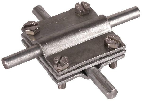 Kreuzstück nach DIN EN 62561-1, für oberirdische Verbindung von Rund- und Flachleitern in Kreuz-, Parallel- und T-Anordnung. Ausführung mit Zwischenplatte und Schrauben M6.