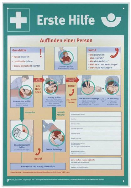 Hinweisschild zum Aushang: ""Erste Hilfe"" nach BGI / GUV-I 510.