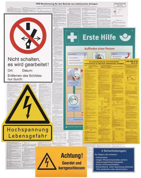 Kompletter Warn- und Hinweisschildersatz, zum Aushang und für Arbeiten an elektrischen Anlagen nach DIN VDE 0105-100 und Teil 1 (DIN EN 50110-1) mit folgender Bestückung: Aushang “VDE-Bestimmungen für den Betrieb von elektrischen Anlagen”, Aushang “Erste Hilfe” – Aushang nach BGI 510, Aushang “Brandbekämpfung und technische Hilfeleistung im Bereich elektrischer Anlagen”, Verbotsschild “Nicht schalten. Es wird gearbeitet“, Warnschild “Hochspannung – Lebensgefahr”, Warnschild “Achtung! Geerdet und kurzgeschlossen!”, Hinweisschild “5 Sicherheitsregeln”
