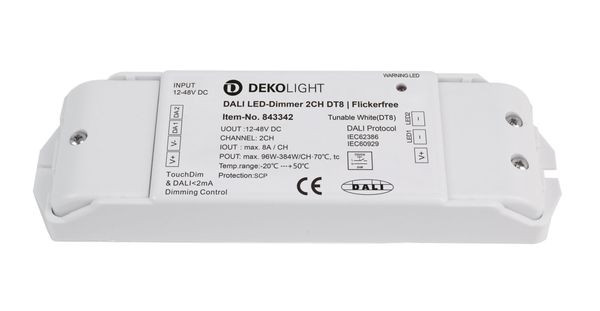 | Kurzbeschreibung | Deko-Light, Niedervolt DALI Dimmer (CV, DC), DALI 2 PWM Dimmer CV 2CH, 12-48V, 8A/CH, DT8, Spannungskonstant, Dimmbar: Ja, DALI 1.0 / DT8, DALI 2.0 / |