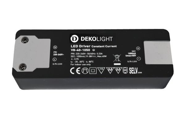 Deko-Light, Netzgerät (CC, DC), BASIC, CC, V8-40-1050mA/40V, Stromkonstant, 20,0-40,0 W, Eingangsspannung: 220-240 V/AC, Ausgangsspannung: 19-38 V/DC, IP 20