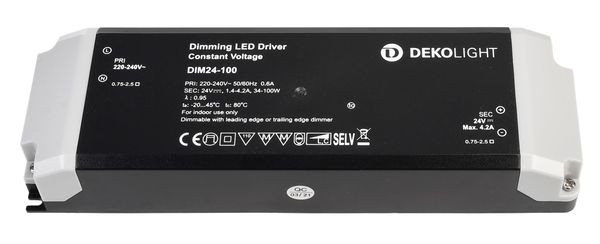 Deko-Light, Netzgerät (CV, DC) dimmbar, BASIC, DIM, CV, 24 V 34-100 W, Spannungskonstant, Dimmbar: Ja, Phasenanschnittsdimmer, Phasenabschnittsdimmer, 34,0-100,0 W, Eingangsspannung: 220-240 V/AC, Ausgangsspannung: 24 V/DC, IP 20