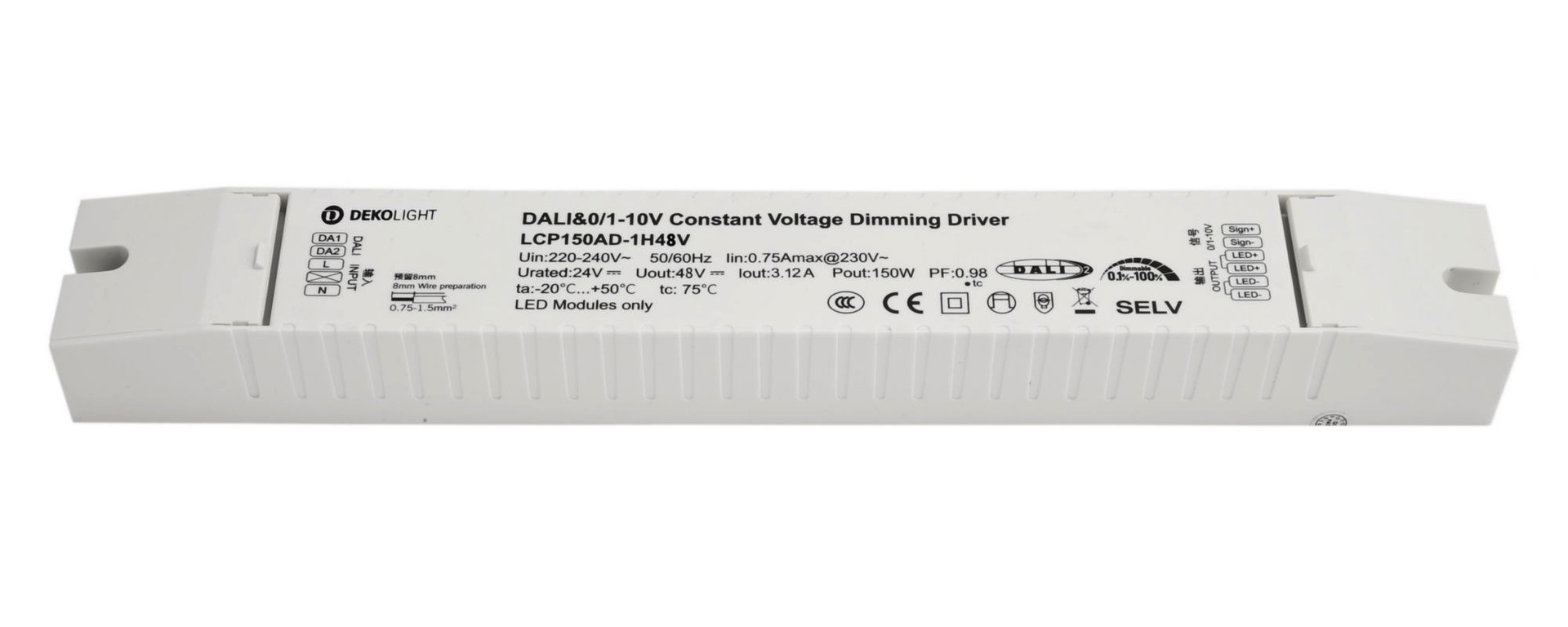 | Kurzbeschreibung | Deko-Light, Netzgerät (CV, DC) dimmbar, BASIC, DIM, CV, LCP DALI, 48V, 150W, IP20, Spannungskonstant, Dimmbar: Ja, DALI 2.0 / DT6, 0-10 V, 1-10 V, Int |