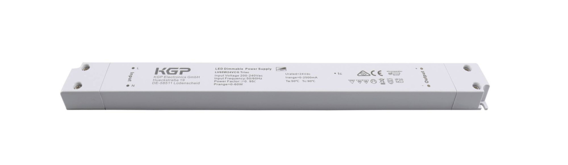KGP, Netzgerät (CV, DC) dimmbar, KGP, Long-Flat, DIM, CV, LV60W24CG Triac, Spannungskonstant, Dimmbar: Ja, Phasenanschnittsdimmer, Phasenabschnittsdimmer, 0,0-60,0 W, Eingangsspannung: 220-240 V/AC, Ausgangsspannung: 24 V/DC, IP 20