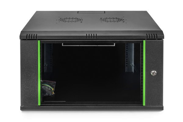 Die Netzwerkschränke zur Wandmontage der Dynamic Serie wurden für einen einfachen und besonders kostenoptimierten Netzwerkausbau entwickelt. Dach, Boden und Rückwand eines jeden Schrankes sind mit einem vorgestanzten Kabeleinlass ausgestattet. Für die Aufnahme eines Lüftermoduls wird das Dachchassis ebenfalls mit einem ausgestanzten Bereich versehen. Zwei Paar galvanisierte, mit in beide Richtungen ablesbare Höheneinheiten beschriftete 483 mm (19")-Profilschienen sind im Inneren verbaut. Diese lassen sich in der Tiefe verstellen. Jeder Schrank ist eine robuste Stahlkonstruktion aus bis zu 1,2 mm starkem Stahlblech. Die Farbgebung erfolgt in Form von elektrostatischer Pulverbeschichtung in den Standardfarben Grau (RAL 7035) und Schwarz (RAL 9005). Abnehmbare Seitenwände sowie die abschließ- und abnehmbare Fronttür, verbessern die Zugänglichkeit. Ein Türanschlagswechsel kann vorgenommen werden. Die Wandmontage erfolgt in zwei einfachen Arbeitsschritten: Das mitgelieferte Montageblech wird an die Wand geschraubt und im Anschluss mit dem Gehäuse verbunden.
