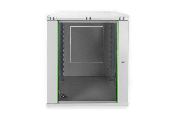 Die Netzwerkschränke zur Wandmontage der Dynamic Serie wurden für einen einfachen und besonders kostenoptimierten Netzwerkausbau entwickelt. Dach, Boden und Rückwand eines jeden Schrankes sind mit einem vorgestanzten Kabeleinlass ausgestattet. Für die Aufnahme eines Lüftermoduls wird das Dachchassis ebenfalls mit einem ausgestanzten Bereich versehen. Zwei Paar galvanisierte, mit in beide Richtungen ablesbare Höheneinheiten beschriftete 483 mm (19")-Profilschienen sind im Inneren verbaut. Diese lassen sich in der Tiefe verstellen. Jeder Schrank ist eine robuste Stahlkonstruktion aus bis zu 1,2 mm starkem Stahlblech. Die Farbgebung erfolgt in Form von elektrostatischer Pulverbeschichtung in den Standardfarben Grau (RAL 7035) und Schwarz (RAL 9005). Abnehmbare Seitenwände sowie die abschließ- und abnehmbare Fronttür, verbessern die Zugänglichkeit. Ein Türanschlagswechsel kann vorgenommen werden. Die Wandmontage erfolgt in zwei einfachen Arbeitsschritten: Das mitgelieferte Montageblech wird an die Wand geschraubt und im Anschluss mit dem Gehäuse verbunden.