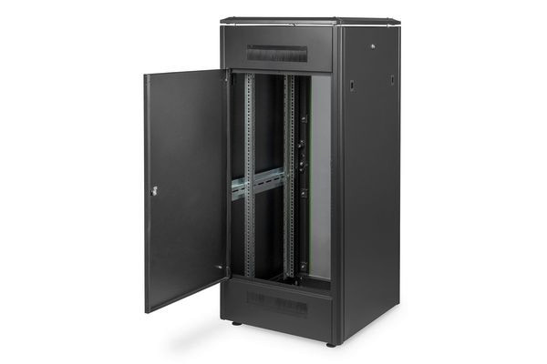 Die Netzwerkschränke der Unique Serie wurden für eine besonders komfortable und flexible Netzwerkverkabelung designt und produziert. Durchdachte Optimierungen bieten marktkonforme Stabilität bei maximaler Flexibilität. Ein modular, durch verschraubte 483 mm (19")-Blindplatten öffenbares Bodenchassis bietet ausreichend Platz für Kabel aller Art. Darüber hinaus befinden sich Kabeleinlässe mit Bürste im hinteren Bereich des Bodenchassis. Rückseitige Bürstenleisten ober- und unterhalb der Rücktür (ab 26HE), ermöglichen den Einsatz bei verschiedensten Anwendungsszenarien. Großzügige vertikale Kabelkanäle mit Kabelführungshilfen und Blende, verbaut in der Frontseite (ab 800 mm Schrankbreite), runden die vielfältigen Eigenschaften des Netzwerkschranks einwandfrei ab. Zwei Paar verkröpfte und galvanisch verzinkte, mit gegenläufig ablesbaren Höheneinheiten beschriftete 483 mm (19")-Profilschienen sind im Inneren verbaut. Sie lassen sich stufenlos verstellen und sind mit zusätzlichen Tiefenstreben im Schrank verbunden. Jeder Schrank ist eine robuste Stahlkonstruktion aus bis zu 1,5 mm starkem Stahlblech. Die Farbgebung erfolgt in Form von elektrostatischer Pulverbeschichtung in den Standardfarben Grau (RAL 7035) und Schwarz (RAL 9005). Modular abschließ- und abnehmbare Seitenwände sowie Türen verbessern die Zugänglichkeit. Ein Türanschlagswechsel kann vorgenommen werden. Des Weiteren sind die Schränke auf Grund der zerlegbaren Konstruktion bei Bedarf komplett demontierbar. Unter Berücksichtigung von Faktoren wie beispielsweise den Gewichten sowie der Wärmeentwicklung von Einbaukomponenten lassen sich, je nach Anwendungsfall, alle DIGITUS® Unique Netzwerkschränke auch als Serverschränke nutzen. Der Einbau von perforierten Stahlblechtüren sorgt bei solchen Varianten für eine verbesserte passive Kühlung der verbauten Komponenten. Ein von DIGITUS® als Serverschrank definiertes Modell wird beispielsweise in der Standardkonfiguration der Unique Server-N Serie zusätzlich um rückseitige PDU-Halterungen ergänzt.