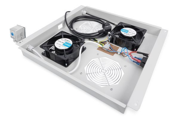 Dachlüftereinheit, 2 Lüfter, grau für Unique, Unique Light, Unique Server-N Das DIGITUS® 483 mm (19")-Zubehör ist für die hohen Anforderungen der IT-Infrastruktur entwickelt, es wird nach deutschen Qualitätsstandard hergestellt. - Einfacher Einbau in das Dachmodul des 19"-Schrankes - Die Abwärme der Einbaukomponenten wird über die Lüftereinheit aktiv nach oben abgeführt - Zwei verbaute Lüfter - Inklusive einstellbarem Thermostat und EIN-/AUS-Schalter Die Dachlüftereinheiten sind geeignet für alle Netzwerkschränke der Unique & Unique Light Serie, sowie alle Serverschränke der Unique Server-N Serie. Im Dachmodul des Schrankes kann die Installation schnell und einfach mit wenigen Schritten vorgenommen werden. Ausgestattet mit einem EIN-/AUS-Schalter sowie einem regalbarem Thermostat bietet jede Lüftereinheit die beste Einsatzbereitschaft nach individuellen Bedürfnissen. Das Modell ist erhältlich in den Standardfarben Grau (RAL 7035), sowie Schwarz (RAL 9005), wahlweise mit zwei oder vier Lüftern ausgerüstet.