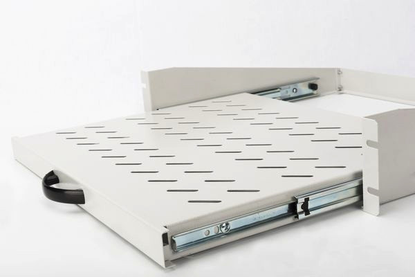 Der Fachboden zum Festeinbau lässt sich einfach den vorderen 483 mm (19“)-Profilschienen Ihres 483 mm (19“) Netzwerk- oder Serverschrankes installieren. Durch die kompakte Bauform ist er besonders für 483 mm (19“)-Wandgehäuse ab einer Tiefe von 450 mm geeignet. Der Fachboden ist mittels eines Griffes ausziehbar, erleichtert somit den Zugang und ist durch das stabile, perforierte Lochblech mit einer hohen Traglast die optimale Tragfläche für nicht 483 mm (19“) einbaufähige Komponenten.