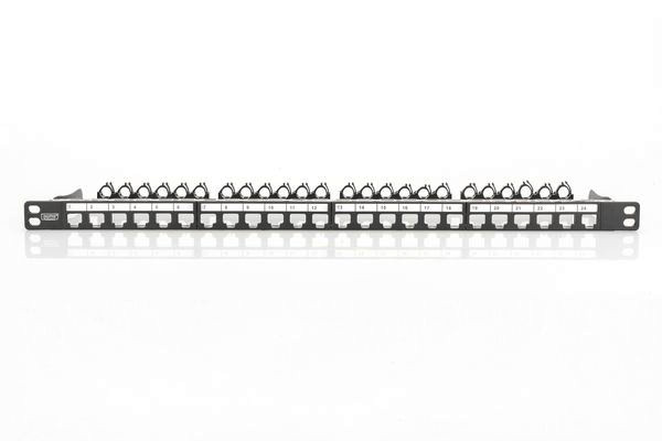 Das DIGITUS® 24-Port 0,5HE Patch Panel bietet Ihnen eine hohe Packdichte. Da das Panel nur 0,5HE hoch ist, können auf 1HE 48 Ports (2 Panels mit jeweils 24 Port) installiert werden.