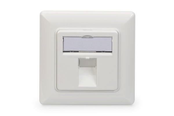 Frontplatte für Keystone Jacks, 1x RJ45 Staubschutz, 80x80 + Zentralplatte, reinweiß, Die DIGITUS®-Frontplatten eignen sich für den Anschluss aller geschirmten DIGITUS®-Keystone-Module. Die mitgelieferten Staubschutzklappen bieten perfekten Schutz. Die Anschlüsse der Module sind vertikal im 45°-Winkel (deutsches und britisches Layout) oder horizontal im 90°-Winkel (französisches Layout) angeordnet.