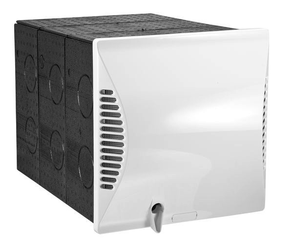 Quadratische Wandhülse aus EPP, 320 x 320 mm (Durchbruch in Außenwand 325 x 325 mm), Länge 480 mm, bauseits anzupassen an Wandstärke 320 - 480 mm, inkl. Zubehör zur Anpassung des Lüftungsgerätes an die Wandstärke und UV-beständige Außenwandblende aus Kunststoff mit Tropfkante und integrierter Kondensatableitung (348 x 365 x 55 mm). Wandhülse und Außenwandblende (Brandklasse B2) sind für die Installation des Lüftungsgerätes funktionsnotwendig.