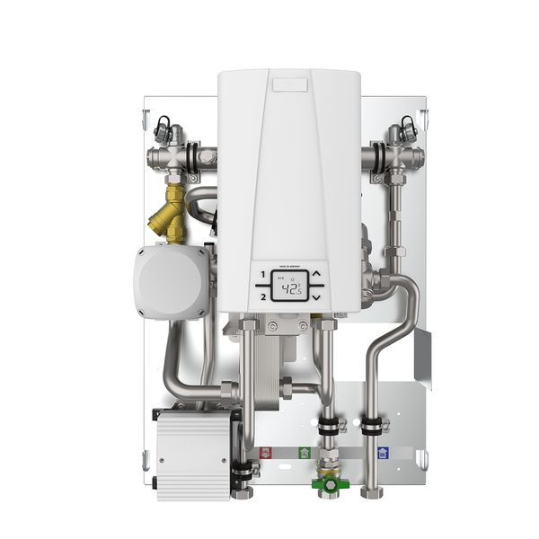 Gasthermenaustauschstation GTA HY für den Austausch von Kombi-Gasthermen in Bestandsbauten durch eine Wärmepumpenanlage. Mittels identischer Anordnung der Trinkwasseranschlüsse am Modul ist ein Austausch und der Neuanschluss durch flexible Anschlussschläuche einfach und schnell realisierbar. Der vorhandene, aber nicht mehr benötigte Schornstein kann hierbei als Zuleitungsschacht für die Wärmeversorgung der Station(en) umfunktioniert werden. Hygienische Warmwasserbereitung mittels Edelstahl-Plattenwärmeübertrager für den ersten Temperaturhub der mit Hilfe eines integrierten Durchlauferhitzers auf die gewünschte Zapftemperatur erhöht werden kann. Max. Zapfleistung 12 l/min. Folgende Komponenten sind platzsparend vorinstalliert: Plattenwärmeübertrager edelstahlgelötet mit 44 Platten, Umschaltventil für Warmwasserbereitung,Passstück 3/4" (Länge 110 mm) und Fühlerhülse Ø 5 mm für den Einbau eines Wärmezählers, Schmutzfänger und Regulierventil im Heizungsvorlauf, Zonenventil im Heizungsrücklauf, Volumenstromsensor und Durchlauferhitzer max. 13,5 kW für Warmwasser. Komplett mit Edelstahl 1.4301 verrohrt und mittels Gummipuffern schallentkoppelt. Lieferung inkl. vormontiertem Frischwasserregler mit einstellbarer Vorwärmstufe und Komfortschaltung zum Warmspülen der Heizungsseite. Die Gasthermenaustauschstation ist für die Aufputz-Montage vorgesehen und wird mit Abdeckhaube ausgeliefert (Farbe weiß - RAL 9016)