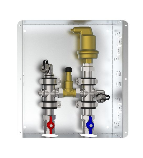 Strangentlüftungssatz SES GTA für Gasthermen-, Trinkwassererwärmungs- und Wohnungsübergabestationen mit Bypass. Die Unterputz-Einbaustation zur automatischen Strangentlüftung ist eine komplett vorkonfektionierte Installationseinheit mit automatischer Entlüftung, Spülung und Wartungsfunktion zur Optimierung von Heizungs- und Warmwassersystemen. Überströmventil zur Warmhaltung des Heizungsstrangs integriert (Werkseinstellung 40 °C), um eine kontinuierliche Bereitstellung von warmem Wasser und Heizung sicherzustellen. Im Bypass integriertes Regulierventil für die optimale Einstellung des Vordruckes. Bestehend aus je zwei Spül-, Füll- und Entleerungshähnen, einem Großentlüfter im Rücklauf, einem Regulierventil und einem Überströmventil im Bypass. Um die Wartung des Großentlüfters zu erleichtern, sind Kugelhähne im Vor- und Rücklauf installiert. Lieferung inkl. Unterputzschrank und Deckel, Farbe RAL 9016. Anschlussnennweite 3/4", max. Betriebstemperatur 110 °C, max. Betriebsdruck 10 bar.