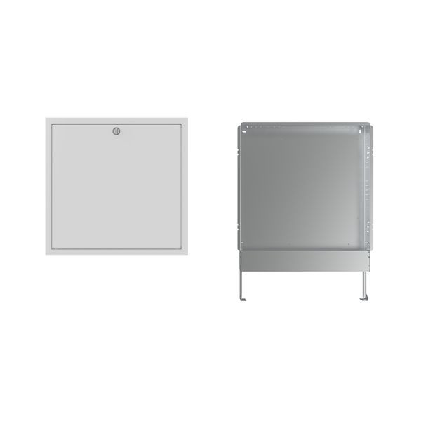 Montage- und Installationsschrank für die Unterputzmontage zum einfachen, variablen und sicheren Einbau der verschiedenen Module für die Trinkwasserbereitung (nicht für den Einbau von Heizkreisverteilern geeignet). Bestehend aus Einbauzarge und Frontblende Feuerverzinktes Stahlblech, alle sichtbaren Teile in weiß RAL 9016 Schrankfüße bis 160 mm ausziehbar vorbereitete Aufnahmepunkte für Trinkwassermodul und Kugelhahnschiene vorgefertigte Halterungspunkte für Einbau in Trockenbauwänden Schrankmaße Einbauzarge B x H x T: 724 x 798-958 x 110 mm komplett mit Frontblende B x H x T; 748 x 813-973 x 122-162 mm