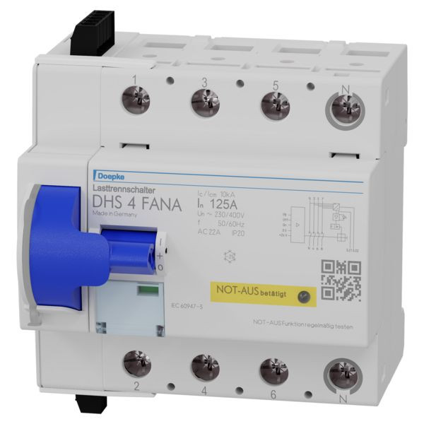 Lastrenn- bzw. Hauptschalter trennen elektrische Verbraucher oder Anlagenteile vollständig und allpolig von der elektrischen Versorgung. Sie schalten auch unter Last oder Überlast. Sie werden zur Abschaltung für Wartungsarbeiten und zum Anlagenschutz eingesetzt. Die Geräte der Baureihe DHS 4 sind Lasttrenn- bzw. Hauptschalter in vierpoliger Ausführung bei denen der N-Kontakt voreilend eingeschaltet und nacheilend ausgeschaltet wird. Durch ihre Bauart fügen sie sich hervorragend in die Optik der Fehlerstromschutzschalter DFS ein. DHS 4 der Variante FANA erlauben das Ein- und Ausschalten von Geräten aus der Ferne. Außerdem können Betätigungselemente, wie z.B. Taster zur Abschaltung des Lasttrennschalters in Notsituationen, über das kompakte, werkseitig angebaute Zusatzmodul angeschlossen werden. Auch eine Parallelschaltung mehrerer DHS 4 ist möglich. Die im Lasttrennschalter integrierte LED zeigt sowohl die Auslösung durch ein Betätigungselement als auch einen möglichen Drahtbruch an. Eine Wiedereinschaltung des Lasttrennschalters wird in diesem Zustand verhindert.
