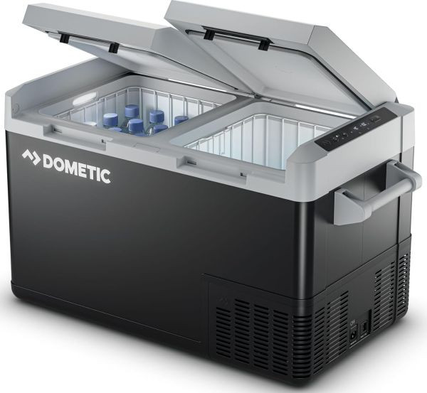 tragbare Kompressorkühlbox mit 2 Fächern mit unabhängiger Temperaturregelung, für 17 (11+6) herkömmliche 1,5-l-Flaschen oder 100 Dosen (60+40; 330 ml), Anschlussmöglichkeiten 12/24 V DC und 110 - 240 V AC, Kühl-/Gefriertemperatur lässt sich zwischen +20 und -18 °C einstellen und hält die Temperatur unabhängig von der Umgebungstemperatur bei minimalem Stromverbrauch, digitales Display (dimmbare Anzeige) für bequemes Einstellen und Überwachen der Kühltemperatur, Innenauskleidung aus Kunststoff mit 2 Korbeinsätzen, LED-Innenbeleuchtung, robuste Tragegriffe, dreistufiges Batterieschutzsystem mit automatischer Abschaltung, um die Entleerung der Autobatterie zu vermeiden, sowie Stromaufnahmemöglichkeit durch Doppelbatteriesysteme