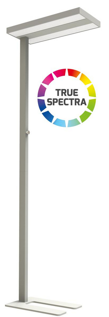 Natürliches Tageslicht mit TRUEspectra Technologie, echtes Vollspektrum und Tageslicht bieten gesundes Licht am Arbeitsplatz Augenschonend durch reduzierten Blaulichtanteil der TRUEspectra LEDs Verbesserte Aufmerksamkeit, Behaglichkeit, Stimmung und Schlafintensität Einfache Helligkeitseinstellung durch manuellen Dreh-Dimmer ohne Sensorik UGR Blendfreie, homogene und schattenfreie Lichtverteilung / glatte Oberseite (Uplight:5500 lm / Downlight: 3250 lm ) Bessere Kontrastwiedergabe bei sehr guter Farbwiedergabe CRI>95 und konstanter Farbtemperatur Metall-/Aluminiumgehäuse in silber ähnlich RAL7038 mit schwerem U-Stahlfuß 1,8 m Anschlusskabel mit Kaltgerätestecker Umweltfreundliche Lieferung der Leuchte in einem kompakten Paket (Europalettenlagerfähig)
