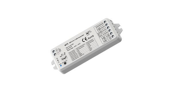 Funkempfänger mit DOTLUX Fusion Technologie 5 in 1 Funktion, kompatibel für die Steuerung von RGB, RGBW, RGBW/WW, Farbtemperatur oder einfarbigen LED-Streifen. DC Eingang und 5-Kanal-Konstantspannungsausgang. Tuya APP Cloud-Steuerung, Unterstützung ein / aus, RGB-Farbe, Farbtemperatur und Helligkeit einstellen, Verzögerung ein / aus Licht, Timer-Lauf, Szene und Musikwiedergabe-Funktion. Sprachsteuerung, Unterstützung von Amazon ECHO und andere Smart Speaker. Jeder Controller kann auch als TUYA-Fusion-Konverter arbeiten, dann verwenden Sie die Tuya APP, um eine oder mehrere Fusion-LED-Controller der selben Art zu steuern.