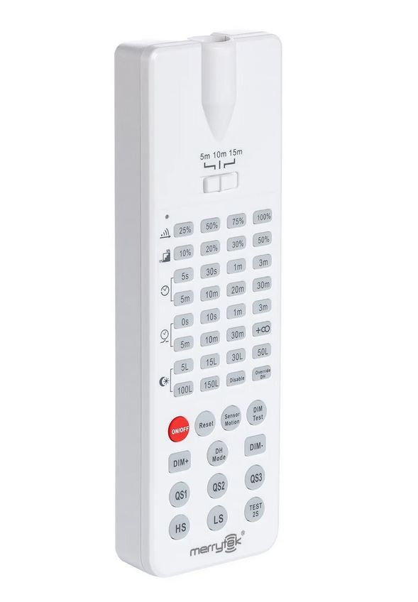 Fernbedienung mit erhöhter Reichweite zum einstellen der Sensorfunktionen der MISTRALsensor Geeignet für Lichtpunkthöhe ab 4m Eine Fernbedienung kann für beliebig viele Leuchten MISTRALsensor verwendet werden. Die Fernbedienung muss auf die Leuchte gerichtet werden, um Einstellungen zu verändern. Folgende Werte sind stufenweise einstellbar: Reichweitenbereich über dip Switch 5m/10m/15m Tageslichtsensor (5 / 15 / 30 / 50 / 100 / 150 Lux deaktiviert) Leuchtdauer (5s / 30s / 1min / 3min / 5min / 10min /20min / 30min) Nachleuchtdauer ( 0s / 10s/ 1min / 3min / 5min / 10min / 30min / dauerhaft) Nachleuchthelligkeit (10% / 20% / 30% / 50%) Erfassungsbereich (25% / 50% / 75% / 100%)