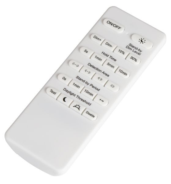 Fernbedienung für DOTLUX SURFACEsensor und SURFACEsensor-exit Diese Fernbedienung wird benötigt um den Bewegungssensor und den Tageslichtsensor der SURFACEsensor Leuchten einzustellen. Sie benötigen nur eine Fernbedienung für beliebig viele Leuchten Die Fernbedienung muss auf die Leuchte gerichtet werden, um Einstellungen zu verändern (Infrarot) Die Leuchte quittiert optisch durch ein blinken die Einstellung Es können folgende Werte eingestellt werden: Reichweitenbereich in 3 Stufen (100%, 75%, 50%, 25%) 3-5m Tageslichtsensor in 3 Stufen (Aus, 15Lux, 50Lux) Leuchtdauer ( 5sek, 1min, 5min, 10min) Standby Helligkeit ( AUS, 10%, 30%) Standby Zeit ( 1min, 10 min, dauerhaft) Nachtlicht (3% Standby) Sensor (An, Aus)