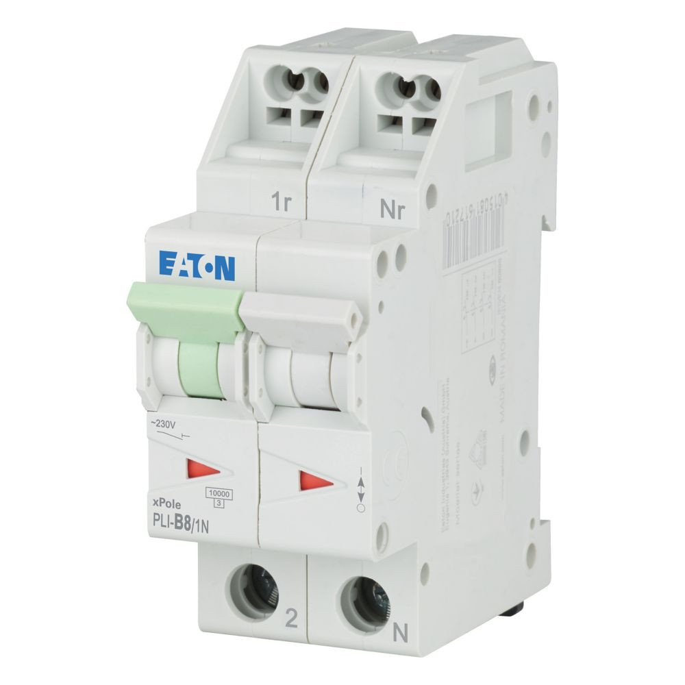 Leitungsschutzschalter, PLI, 1-polig + N, Auslösecharakteristik: B, Bemessungsstrom In: 8 A, Bemessungsschaltvermögen nach IEC/EN 60898-1: 10 kA, Schaltgeräte für den Wohnungsbereich und kommerzielle Anwendungen