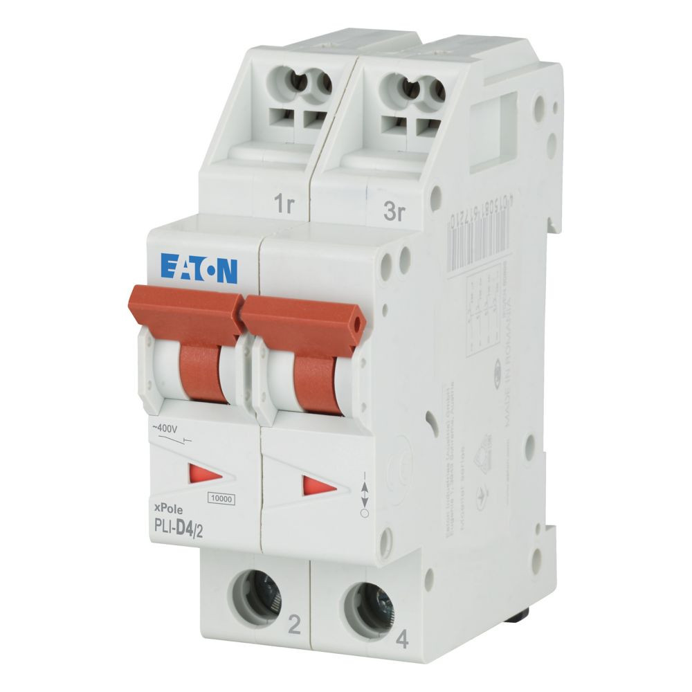 Leitungsschutzschalter, PLI, 2-polig, Auslösecharakteristik: D, Bemessungsstrom In: 4 A, Bemessungsschaltvermögen nach IEC/EN 60898-1: 10 kA, Schaltgeräte für den Wohnungsbereich und kommerzielle Anwendungen