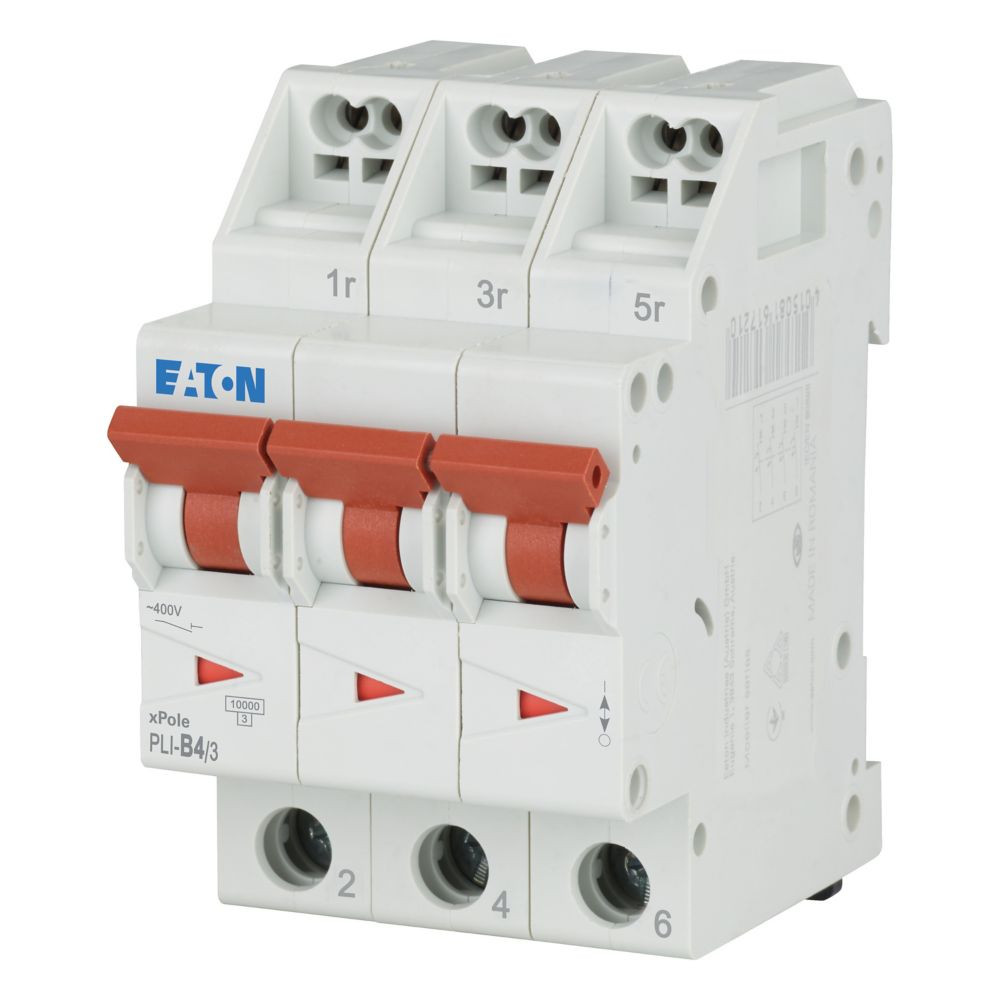 Leitungsschutzschalter, PLI, 3-polig, Auslösecharakteristik: B, Bemessungsstrom Ein: 4 A, Bemessungsschaltvermögen nach IEC/EN 60898-1: 10 kA, Schaltgeräte für den Wohnungsbereich und kommerzielle Anwendungen