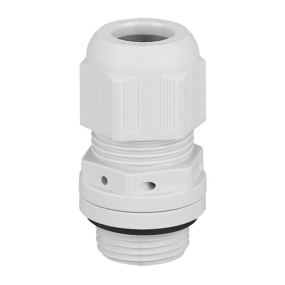 Kabelstutzen mit integriertem Druckausgleich, Kabeleinführung = M20, Bohrmaß = 20,5 mm, Verwendung Kabel NYM/NYY, 4-Draht = H05VV-F4x2,5/3x4, NYM 5 x 1,5/5 x 2,5 mm², Schutzart IP68, Polyamid, halogenfrei, RAL 7035, mit Kontermutter und integrierter Zugentlastung, Brandklasse V2 nach UL94