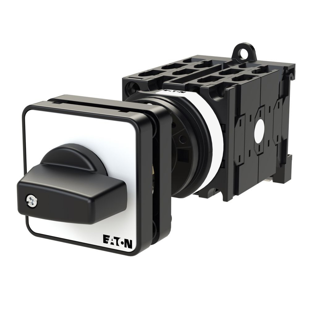 Umschalter, Sortiment: Steuerschalter, Normen und Bestimmungen: IEC/EN 60947, VDE 0660, IEC/EN 60204, CSA, UL, Lasttrennschalter nach IEC/EN 60947-3, Typkenner: T0, mit schwarzem Knebel und Frontschild, Kontakte: 10, Schutzart: Front IP65, Bauform: rückseitiger Einbau, Schaltwinkel: 45 °, Schaltverhalten: rastend, mit 0-Stellung, 5 Baueinheit(en), Bemessungsdauerstrom: Iu= 20 A, Frontschild: Phase-0-Erde