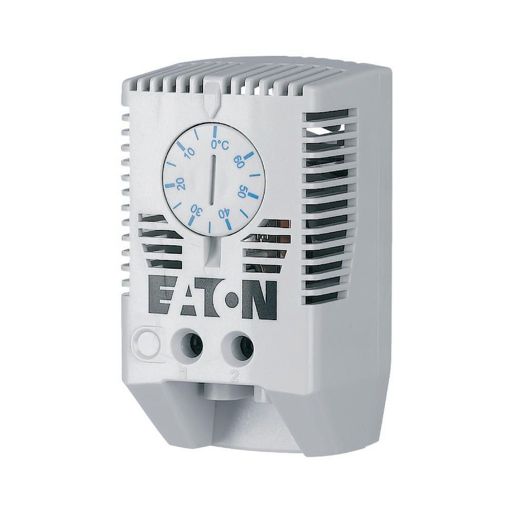 Thermostat mit einer Schalttemperaturdifferenz von weniger als 7 K, einstellbare Temperatur, mit Schließer mit Sprungkontakt, Temperaturbereich 0 bis 60C°, min. Schaltspannung 120 bis 240V AC 10 A max. 30 W, Schutzart IP20, Fühlertype Bimetall, Schraubklemmen für Kabelquerschnitt 0,5 bis 2,5 mm², thermische Rückführung, geeignet für den Betrieb von Lüftungen, Schnappbefestigung für 35 mm Profilschiene nach EN 60715, Farbe RAL7035