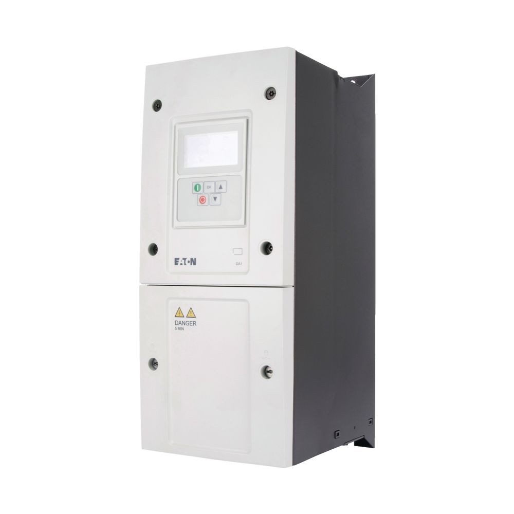 Frequenzumrichter, Typkenner (z. B. DIL): DA1, Bemessungsbetriebsspannung: Ue = 230 V AC, 3-phasig, 240 V AC, 3-phasig, Ausgangsspannung bei Ue: U2 = 230 V AC, 3-phasig, 240 V AC, 3-phasig, Netzspannung (50/60Hz): ULN = 200 (-10%) - 240 (+10%) V, Bemessungsbetriebsstrom bei 150% Überlast: Ie = 24 A, Hinweis: Bemessungsbetriebsstrom bei einer Schaltfrequenz von 8 kHz und einer Umgebungslufttemperatur von +40 °C, Hinweis: Überlastzyklus für 60 s alle 600 s, Zugeordnete Bemessungsbetriebsleistung Hinweis: für normal, intern und extern belüftet, 4-polig, Drehstrom-Asynchronmotoren mit 1500 U/min –1 bei 50 Hz oder 1800 min –1 bei 60 Hz