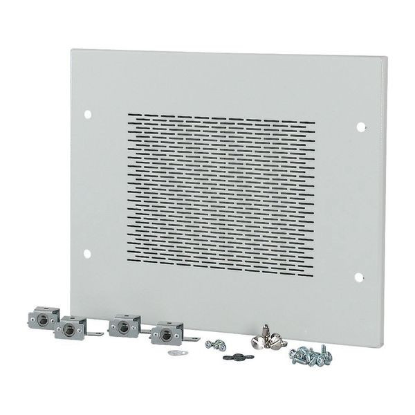 starre Frontplatte mit der Höhe von 350mm und der Breite von 425mm, Stahlblech, kunststoffbeschichtet, RAL 7035, 4 fach verschraubbar, belüftet, IP31