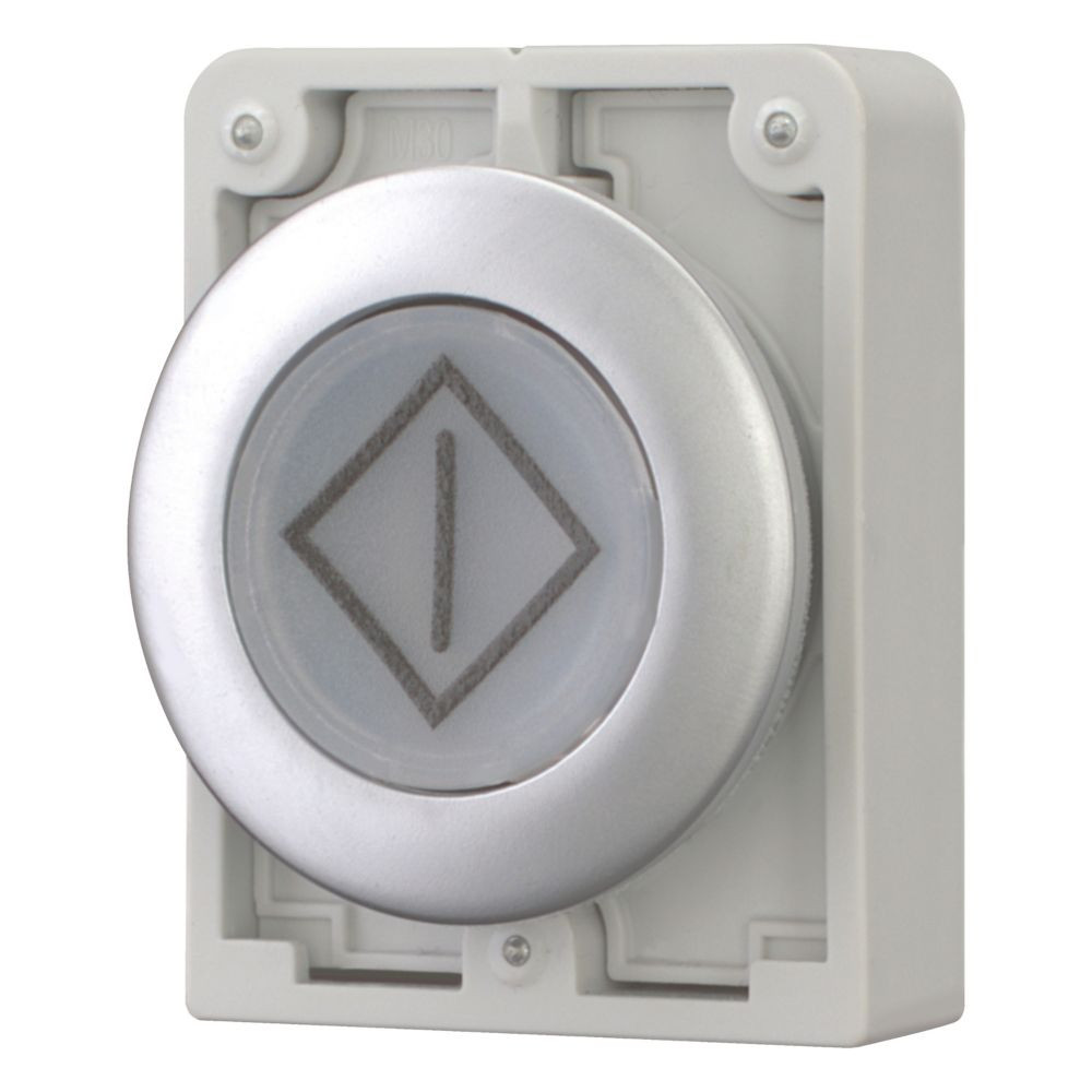 | Kurzbeschreibung | Leuchtdrucktaste, RMQ-Titan, flach, tastend, weiß, beschriftet, Frontring Metall |