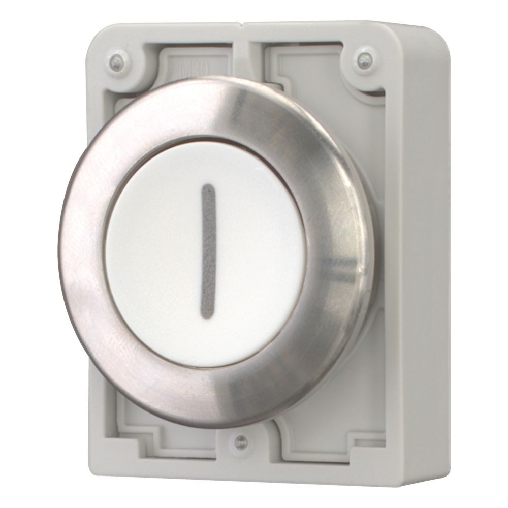| Kurzbeschreibung | Drucktaste, RMQ-Titan, flach, rastend, weiß, beschriftet, Frontring Edelstahl |