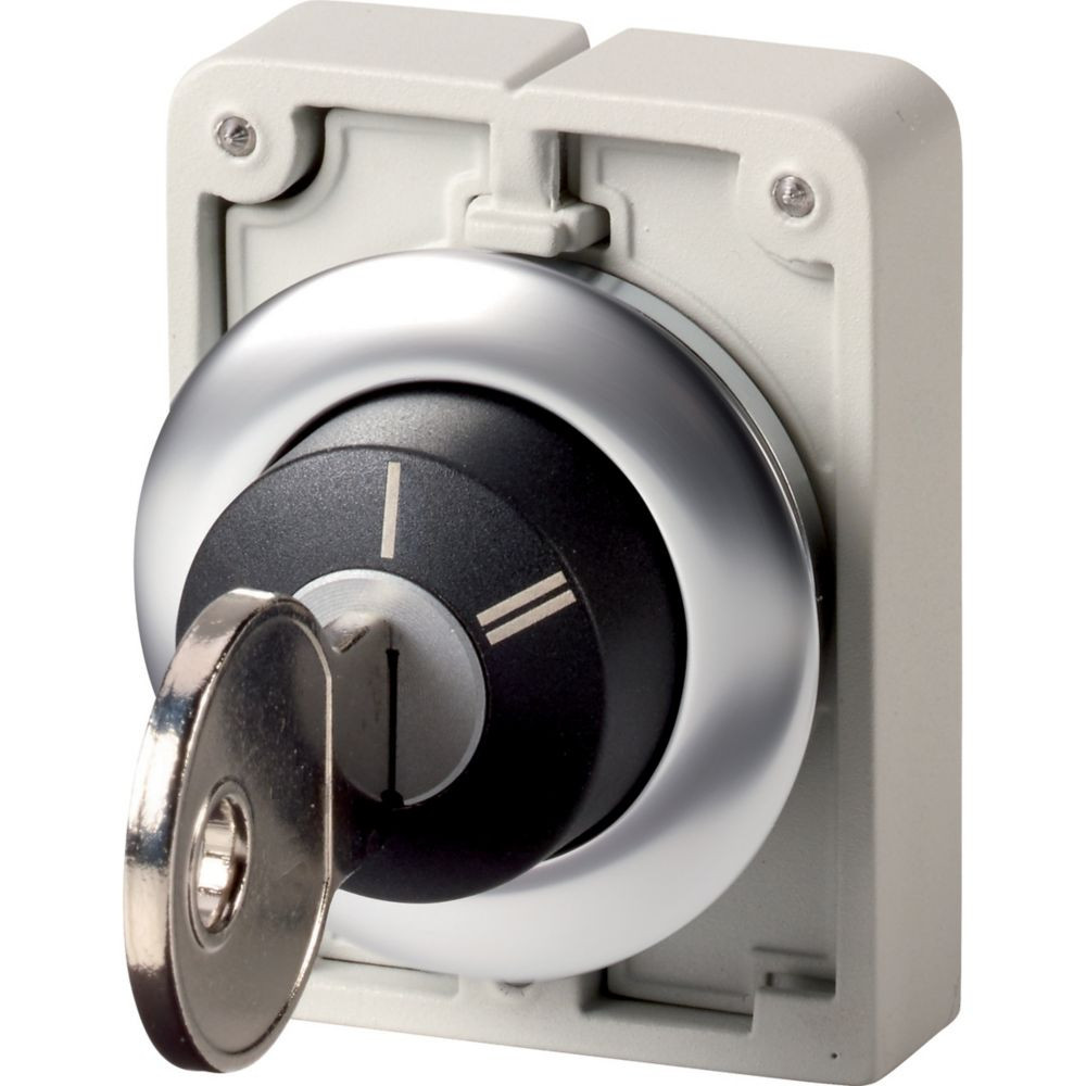 Schlüsseltaste, Sortiment: RMQ-Titan, Einzelgerät, Bauform: Schlüsselbetätigter Verriegelungsmechanismus, rastend, nicht schließanlagenfähig, 2 Stellungen, II, Tastenplatte: schwarz, beschriftet, Schutzart: IP64, Frontring Edelstahl, Anbindung an SmartWire-DT: ja, mit RMQ-SWD-Anschaltungen, Frontabmessung: Ø 36mm, Hinweise: Rast-/Tastfunktion, austauschbar mit Codierteilen M22-XC-Y, Schlüssel abziehbar konvertibel mit Codier-Adaptern M22-XC…, Mit 1 Schlüssel, Normen und Bestimmungen: IEC/EN 60947, VDE 0660, Schutzart: IP64