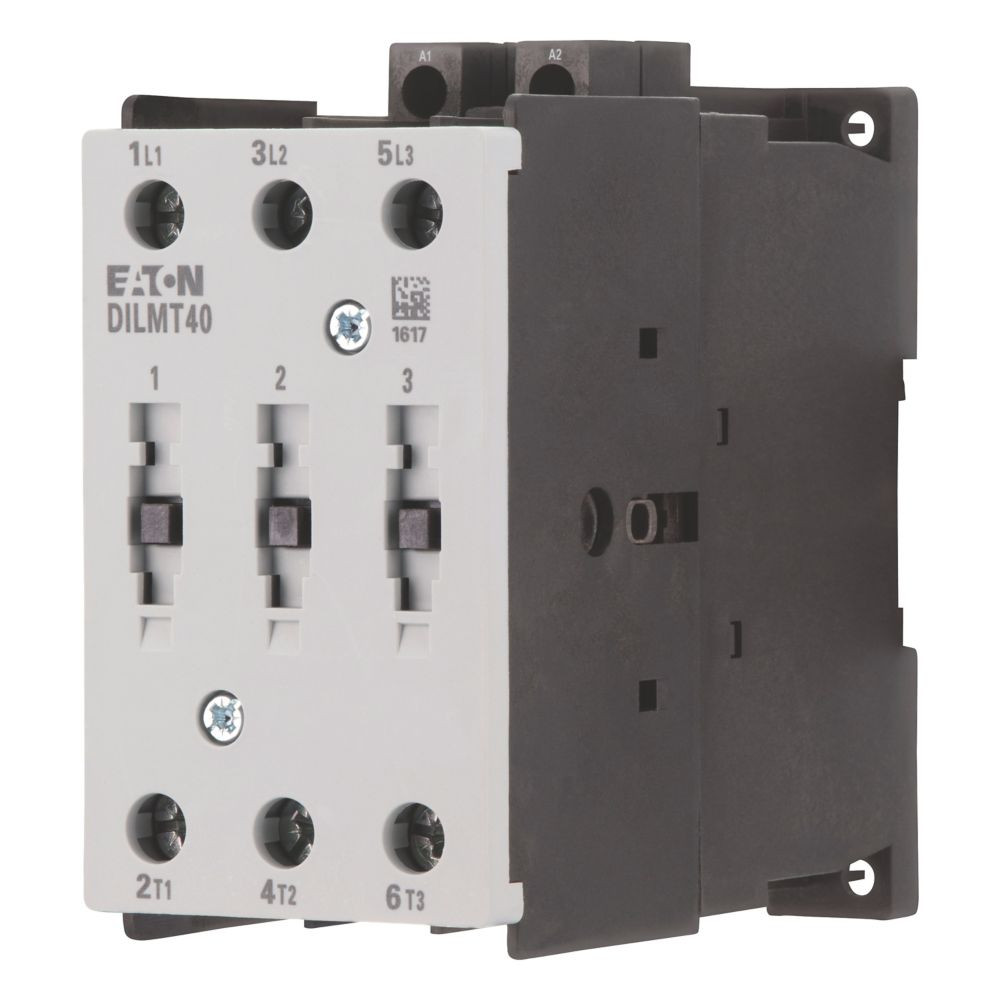 Leistungsschütz, Anwendung: Leistungsschütze für Motoren, Schütze bis 95 A, 3-polig, Gebrauchskategorie: AC-1: Nicht oder leicht induktive Lasten, Widerstandsöfen, NAC-3: Käfigläufermotoren: anlassen, während Betrieb ausschalten, AC-4: Käfigläufermotoren: anlassen, Einstecken, reversieren, Tippen, Anschlusstechnik: Schraubklemmen, Hinweise: Nicht geeignet für Motoren der Effizienzklasse IE3., Anzahl der Pole: 3-polig, Bemessungsbetriebsstrom AC-3, 380 V, 400 V: Ie= 40 A, Bemessungsbetriebsstrom AC-1 konventioneller thermischer Strom, 3-polig, 50 - 60 Hz Offen bei 40 °C: Ith =Ie= 60 A, Max. Bemessung für Drehstrommotoren