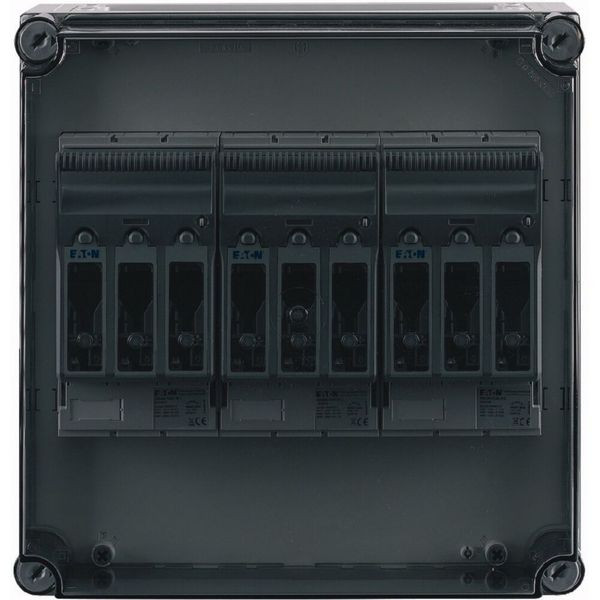 NH-Verteilerschrank mit transparentem Deckel, 3x Schaltanlage NH00 auf Sammelschienensystem 400 A, 3-polig, Träger inklusive für N+PE zum Nachrüsten, mit Kupferschienen L1/L2/L3: 20 x 10 mm, N: ohne, PE: ohne, ohne Klemmen