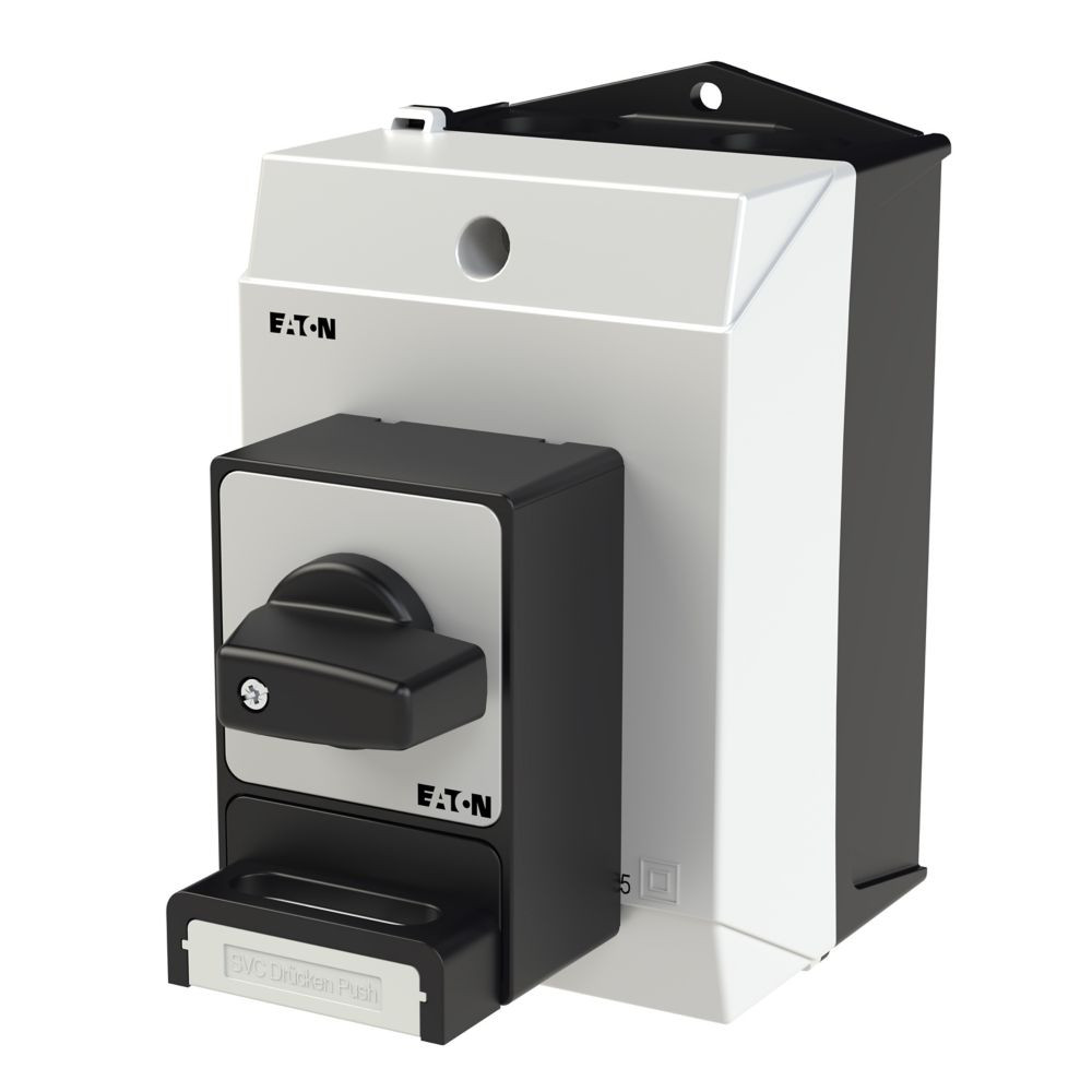 Umschalter, Sortiment: Schalter mit Verriegelungsmechanismus, Normen und Bestimmungen: IEC/EN 60947, VDE 0660, IEC/EN 60204, Lasttrennschalter nach IEC/EN 60947-3, Typkenner: T0, mit schwarzem Knebel und Frontschild, 4-polig, Vorhängeschloss-Sperre SVC, Verriegelungsvorrichtung: abschließbar in 0-Stellung mit Deckelverriegelung, Schutzart: IP65, Bauform: Oberflächenmontage, Schaltwinkel: 45 °, Schaltverhalten: tastend/rastend, 2 Baueinheit(en), Bemessungsdauerstrom: Iu= 20 A, Hinweise: Wenn der Verriegelungsschieber mit Schloss in Stellung HAND verriegelt ist, kann ohne Entfernen des Schlosses auch START betätigt werden, aber nicht 0.