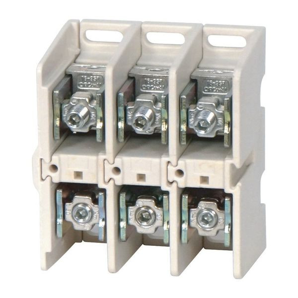 K Anschlussklemmen, für AL und CU, eine Seite rund, eine Seite flach, Bemessungsbetriebsstrom Ie = 160 A, Anzahl der Pole = 3, Anschlussquerschnitte: Kupfer-Rundkabel mehrdrähtig, Sektorkabel mehrdrähtig, Rundkabel eindrähtig, Sektorkabel eindrähtig und Aluminium-Rundkabel eindrähtig, Sektorkabel eindrähtig = 1x 16 bis 95 mm² Aluminium-Sektorkabel eindrähtig = 1x 35 bis 70 mm² Andere Seite: Kupferband 3 x 9 x 0,8 bis 6 x 9 x 0.8 oder Kupferschiene = 18 x 4 mm, Hinweise: Umbausätze von Bandanschluss in Kabelanschluss separat erhältlich, Klemmenabdeckung separat verfügbar