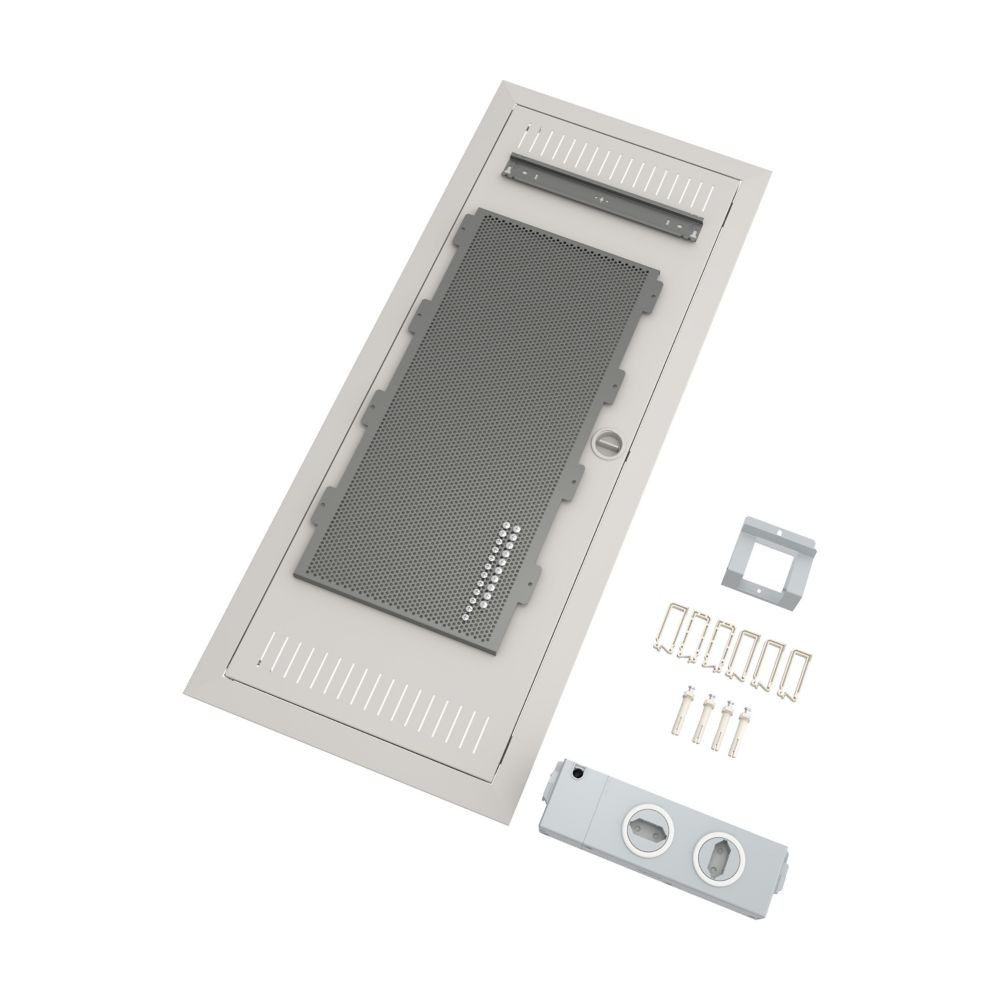 Lieferumfang für Projekte: Ausbausatz für KLV Medienverteiler 5-reihig, Stahlblechtür mit Belüftungsöffnungen, flaches Türrahmendesign. im Lieferumfang enthalten: eine Tragschiene, Mikroperforierte Montageplatte, 1x Geräteträger, 2x einfache Steckdose und Euro2-Adapter, 3D-Putzausgleich mit bis zu 18mm Tiefenausgleich, Kabelbinder, Montageanleitung. Normen: Zugelassen für Multimedia-Anwendungen in GP Universal-Gehäuse gemäß IE/EN 60670-24 und IEC/EN 62208. Schutzklasse II