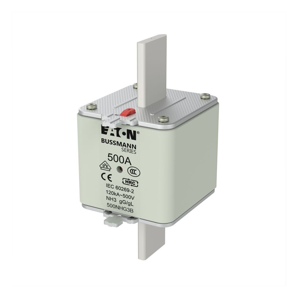 | Kurzbeschreibung | Sicherungseinsatz, Niederspannung, 500 A, AC 500 V, 120 kA, NH3, gL/gG, IEC, Doppelkennmelder, spannungsführende Grifflasche |