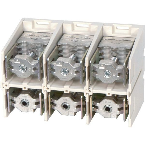 K Anschlussklemmen, für AL und CU, eine Seite rund, eine Seite flach, Bemessungsbetriebsstrom Ie = 1000 A, Anzahl der Pole = 3, Anschlussquerschnitte: Kupfer-Rundkabel mehrdrähtig, Sektorkabel mehrdrähtig, Rundkabel eindrähtig, Sektorkabel eindrähtig und Aluminium-Rundkabel eindrähtig, Sektorkabel eindrähtig = 2x 150 bis 300 oder 3x 50 bis 240 oder Aluminium-Sektorkabel eindrähtig = 2x 150 bis 240 oder 3x 150 bis 185 mm² Kupferband 2x (11 x 21 x 1,10) bis 40 x 1 x 10 oder 50 x 1 x 60 oder Kupferschiene = 15 x mm, Hinweise: Umbausätze von Bandanschluss in Kabelanschluss separat erhältlich, Klemmenabdeckung separat verfügbar