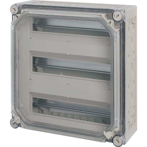 Automaten-Einzelgehäuse mit Tür, Material Polycarbonat, schlagfest, Schutzart IP65, metrische Vorprägungen für Kabelführungen an allen Seiten, zur Montage von Geräten mit einer Baugröße 1 nach DIN 43880, Transparenter Deckel rauchgrau mit Schnellverschlüssen, transparente Tür rauchgrau für Bedienerzugang zu Geräten, Tragschienen zum Aufschnappen der Geräte, Leerplatzabdeckung für unbenutzte Einbaustellen, Berührungsschutzabdeckung mit Beschriftungsstreifen, einschließlich Teilungseinheiten/N-Schienen, Befestigungsbänder zur Wandbefestigung, plombierbare Deckelverschlüsse, Anzahl der Teilungseinheiten = 45