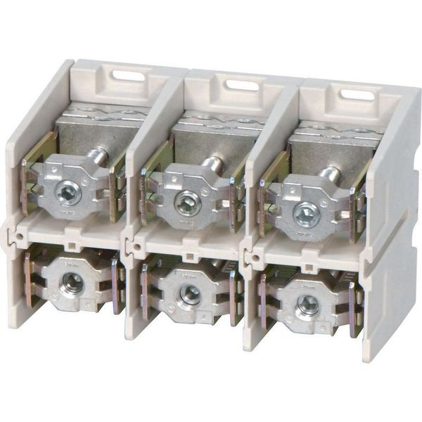 K Anschlussklemmen, für AL und CU, eine Seite rund, eine Seite flach, Bemessungsbetriebsstrom Ie = 800 A, Anzahl der Pole = 3, Anschlussquerschnitte: Kupfer-Rundkabel mehrdrähtig, Sektorkabel mehrdrähtig, Rundkabel eindrähtig, Sektorkabel eindrähtig und Aluminium-Rundkabel eindrähtig, Sektorkabel eindrähtig = 2x 120 bis 240 oder 3x 50 bis 185 mm² oder Aluminium-Sektorkabel eindrähtig = 2x 150 bis 185 oder 3x 95 bis 150 Kupferband 2x (11 x 21 x 1) oder Kupferschiene = 50 x 20 mm, Hinweise: Umbausätze von Bandanschluss in Kabelanschluss separat erhältlich, Klemmenabdeckung separat verfügbar