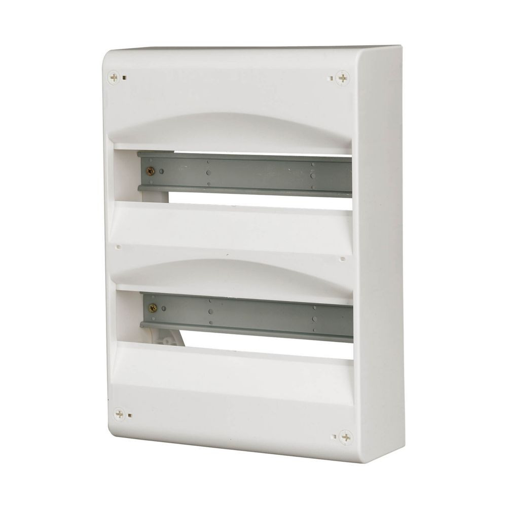 Installationsverteiler zur Aufputzmontage, 2-reihig, 26 MU, Schutzklasse 2, Lieferumfang: Kunststoffgehäuse, DIN-Hutschiene, Null- und Schutzleiterklemme mit Klemmenträger, Rückwand, Montagehinweis, Beschriftungsbogen