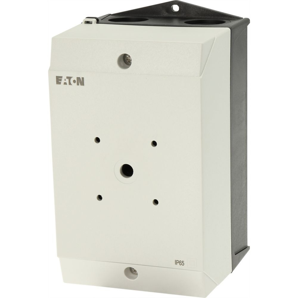 Kleines Gehäuse, Schutzart IP65, glasfaserverstärktes Polycarbonat, Gehäuseunterteil RAL 9005, schwarz/Gehäuseoberteil RAL 7035, hellgrau, Metrische Vorprägungen oben, unten und in der Rückplatte, in der Rückwand, Leitungsdurchsteckmembran, 2 Schutzkappen zum Schutz der Durchdrückmembrane, Leuchtmelder L-. in Unterteilvorprägung M20/M25 einbaubar, für Schalter T3-../Z, 3 – 4 Baueinheiten