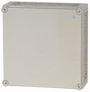 Einzel-Leergehäuse, Material Polycarbonat, schlagfest, Schutzart IP65, patentierter Deckelverschluss mit integriertem Überdruckausgleich, mit metrischen Vorprägungen in allen Seitenwänden, Leitungseinführung oben und unten jeweils=1xM50/32 und 2xM40/25 und 8xM25/16 und 2xM20, seitlich jeweils=1xM63/40 und 6xM25/16 und 10xM20 und 2xM16, Befestigungslaschen für Wandbefestigung, plombierbare Deckelverschlüsse, Seitenwände ausschlagbar, als Verteilergehäuse umbaubar durch ausschlagen der Seitenwände, RAL 7032, kieselgrau (Unterkasten), RAL 7032, kieselgrau (Deckel), Einbautiefe bei Montageplatte=125mm, Ausführung Deckel: undurchsichtig, Ausführung Unterteil: vorgeprägt, Deckel optional nachrüstbar mit Zylinderschloss DVZ...-CI