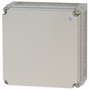 Einzel-Leergehäuse, Material Polycarbonat, schlagfest, Schutzart IP65, patentierter Deckelverschluss mit integriertem Überdruckausgleich, mit metrischen Vorprägungen in allen Seitenwänden, Leitungseinführung oben und unten jeweils=1xM50/32 und 2xM40/25 und 8xM25/16 und 2xM20, seitlich jeweils=1xM63/40 und 6xM25/16 und 10xM20 und 2xM16, Befestigungslaschen für Wandbefestigung, plombierbare Deckelverschlüsse, Seitenwände ausschlagbar, als Verteilergehäuse umbaubar durch ausschlagen der Seitenwände, RAL 7032, kieselgrau (Unterkasten), RAL 7032, kieselgrau (Deckel), Einbautiefe bei Montageplatte=200mm, Ausführung Deckel: undurchsichtig, Ausführung Unterteil: vorgeprägt, Deckel optional nachrüstbar mit Zylinderschloss DVZ...-CI
